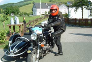 Es war gut warm an diesem 8. Juni als unser Trio, Heiner Rath, Dieter Arabin und auch mein gut gefülltes Gespann in Hirschberg, südwestlich von Warstein gelegen, eintrafen. Zum Teil abgesperrte Straßen, alles sonntäglich geschmückt und vor unserem Quartier, dem Landhotel und Gasthof Cramer spielte eine Blaskapelle. Donnerwetter dachte ich, da hat sich der Theo aber etwas einfallen lassen. Kurzum, die Blasmusik sollte uns noch zwei Tage erhalten bleiben, es war Schützenfest in Hirschberg. Vor dem Abendessen dann Begrüßung aller Teilnehmer durch Veranstalter Theo und Frau Angelika. Auch seitens des Hauses Grußworte und um es vorweg zu nehmen, dieses von Frau Eickhoff geführte Haus gehörte mit zu den besten, die wir bislang hatten. Auch die Qualität der Küche und der Service unerhört gut. Neben vielen neuen Gesichtern, auch etliche treue Mitfahrer, die aus gesundheitlichen Gründen nicht teilnehmen konnten. Die ganze Gruppe wünscht auf diesem Wege gute Besserung. Erwähnt werden sollte auch, dass unser ältester Teilnehmer, Mathies Stüdemann mit Frau Ingrid schon einen Tag früher im Hotel weilten, da sie, statt eine Übernachtung einzuschieben, einfach mal von Hamburg mit ihrem R 60 Gespann auf Achse durchfuhren. Ich sage ja, diese jungen „Hüpfer“.